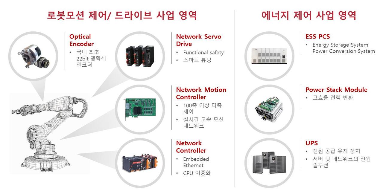 로봇 모션 제어 부문은 다양한 모션 제어기, 터치 패널 제품군, 드라이브 제품군을 제공합니다. 이 제품들은 로봇 시스템, 공작기계, 일반 산업용 장비 등에 광범위하게 사용됩니다. 에너지 제어 부문에서는 연료전지용과 태양광용 PCS를 주요 제품으로 제공하고 있습니다.